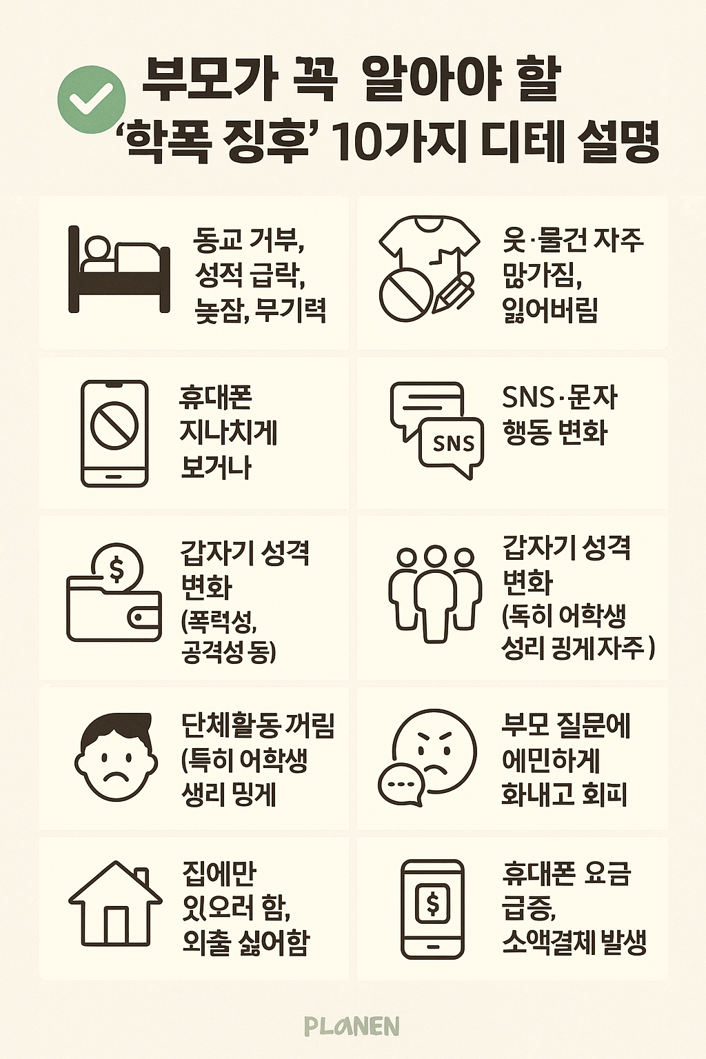 - 집에서도 막말하거나 폭력적 언행 늘어남 → 학폭 스트레스를 집에서 푸는 경우.