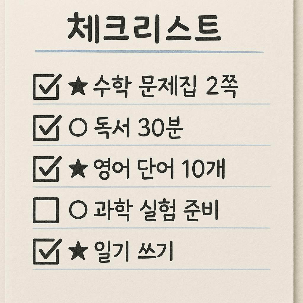👉 다 지켰다면, 스스로 칭찬 + 작은 보상(자유 시간, 간식, 산책 등)으로 동기 부여!