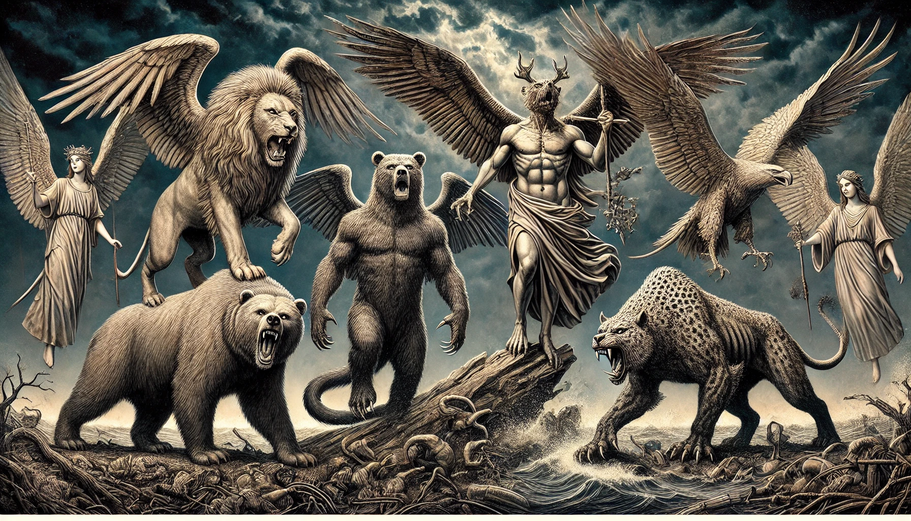 - 네 짐승: 다니엘 7장의 환상에 등장한 네 짐승은 세계 제국의 흥망성쇠를 나타냅니다.