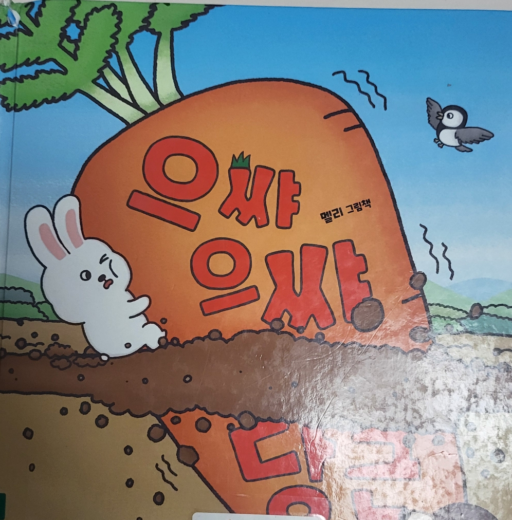 이 책은 "으쌰으쌰 당근"이라는 제목의 어린이 도서예요. 주인공은 귀여운 흰 토끼와 다양한 동물 친구들로, 모두 함께 큰 당근을 뽑으려는 이야기를 담고 있어요.