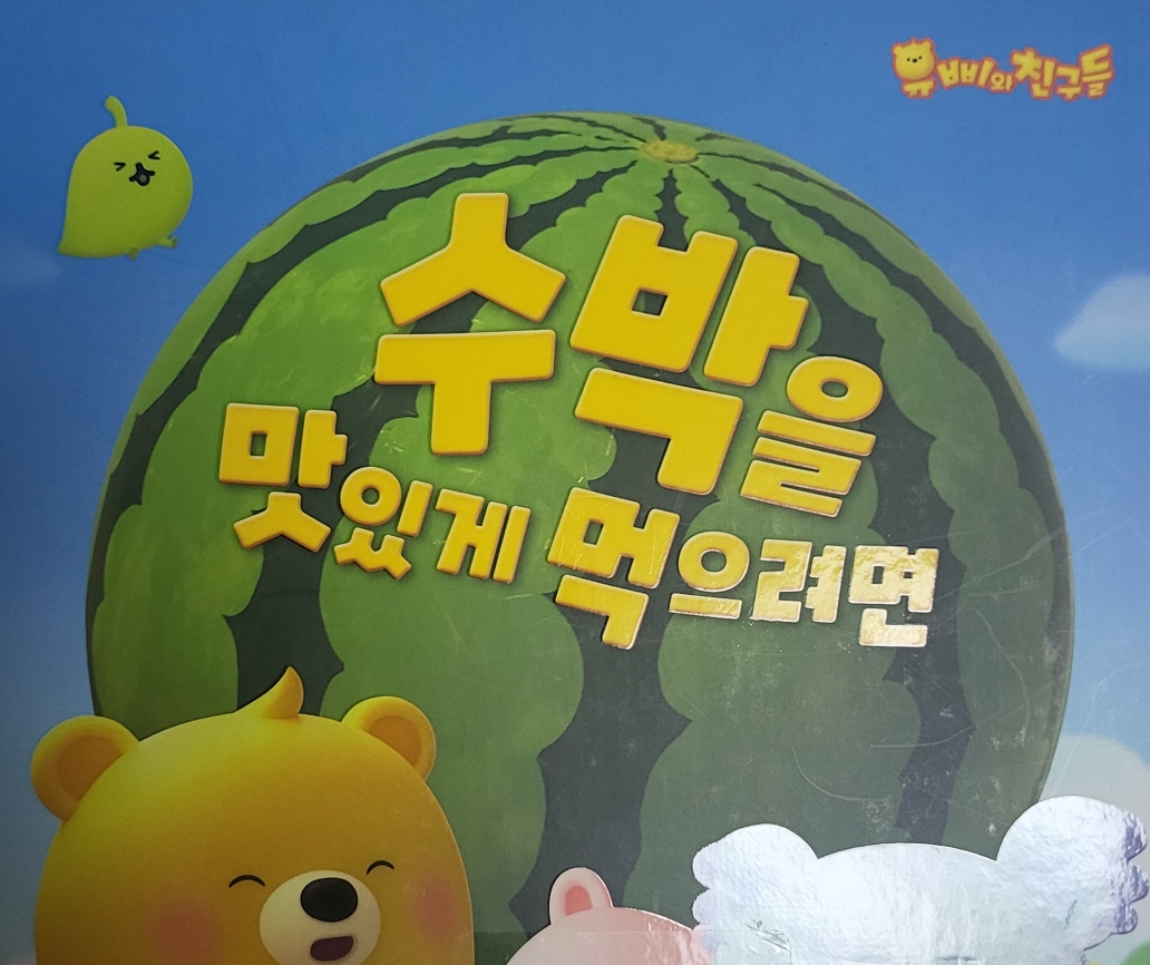 이 책은 "수박을 맛있게 먹으려면"이라는 제목의 어린이 도서예요. 주인공은 노란 곰, 분홍 돼지, 파란 코알라로, 이 친구들이 수박을 맛있게 먹는 방법을 알려주는 이야기입니다.