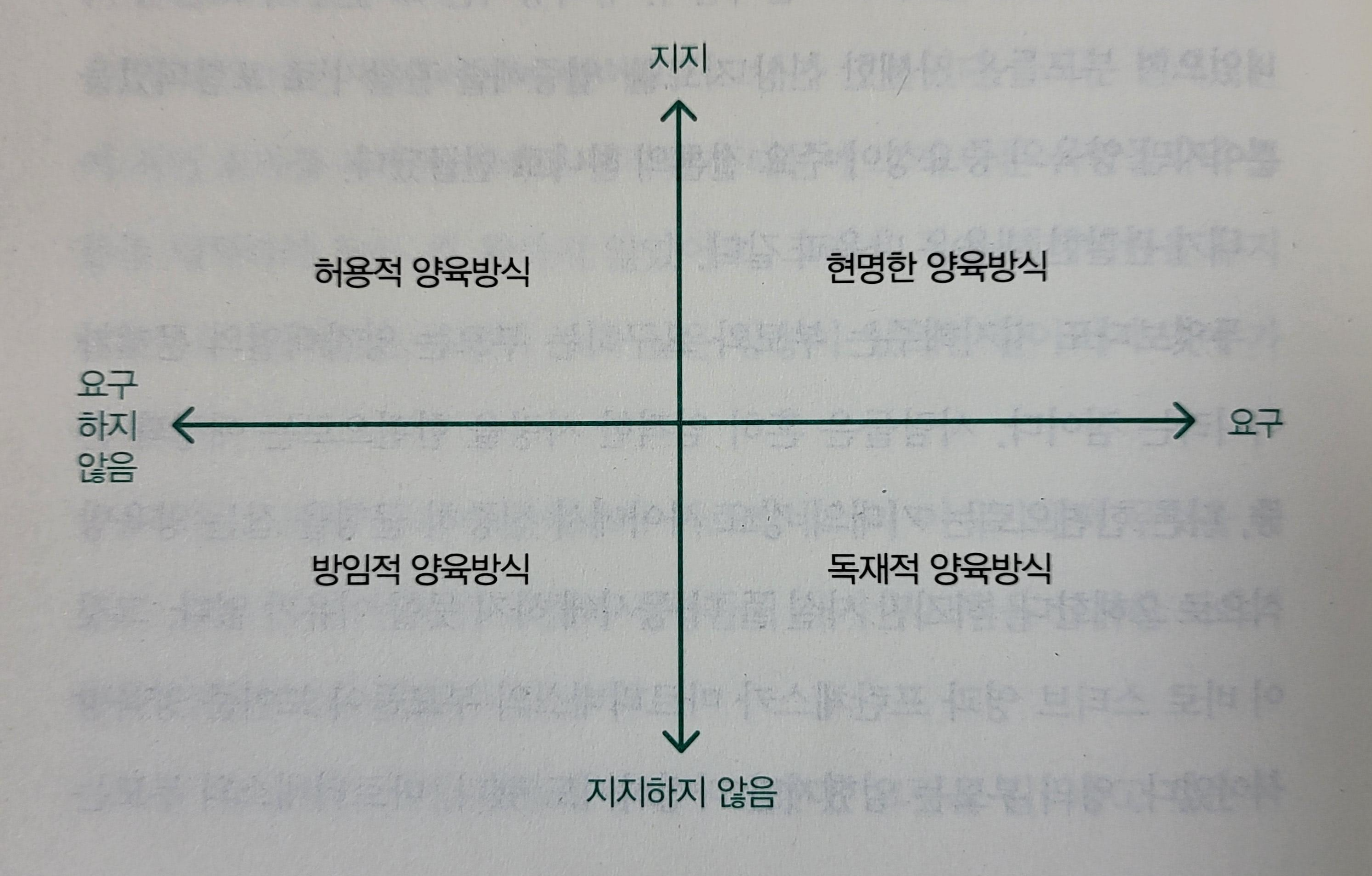 그림은 현재 심리학자들이 분류하고 있는 양육방식이다. 기준이 되는 것은 요구와 지지이다. 요구와 지지가 많은 방식은 d권위적인 양육방식으로 불리우고 있다. 하지만 저자는 현명한 양육방식(wise parenting)이라고 부르고자 한다. 이 유형의 특징은 자녀의 심리적 욕구를 정확히 판단하기 때문이다. 그들은 자녀가 잠재력을 최대한 실현하려면 사랑, 한계, 자유를 필요로 한다는 점을 인식하고 있다. 그들의 권위는 권력이 아니라 지식과 지혜를 바탕으로 한다. 또한 가장 중요한 것은 받아들이는 아이의 관점이다. 똑같이 TV시청을 금지하더라도 받아들이는 아이의 입장에서 독재로 받아들일 수도 있고 그럴만한 이유를 알고 수용할 수도 있는 것이다. 부모와의 설전을 어떻게 해석해야 하는지는 아이의 경험을 바탕으로 한다. 또 자녀는 부모의 행동을 모방한다. 모방에는 흉내내기와 본받기가 있다. 흉내내기는 행위의 본질은 이해하지 못한다. 그저 나타나는 행동을 따라하는 것이다. 하지만 본받기는 나이가 들면서 자신의 행동을 반성할 능력이 생기고 타인의 존경스러운 점과 경멸스러운 점을 판단한다. 부모가 사랑해주고 존중해주고 기대와 요구를 하면 우리는 그들의 본보기를 따를 뿐 아니라 그들을 존경한다. 그런 점에서 자녀에게 그릿이 생기길 바란다면 내 인생의 목표를 살펴보고 나는 얼마나 인생에 목표에 끈기와 열정을 가지고 있는지 살펴봐야 한다. 그릿이 많은 사람들의 대부분은 부모의 그릿에 영향을 받았다는 것을 알 수 있다. 가장 존경하고 영향을 많이 받은 롤모델이 부모님이라고 말하는 그릿의 전형이 어찌나 많은지 놀라울 지경이다. 그들은 부모님에게 자부심과 존경심을 느꼈다. 그런 부모가 없더라도 인생의 적절한 순간에 적절한 방식으로 목표를 높게 잡을 수 있게 지지해주고 격려해주고 자신감을 북돋아주는 사람이 있었다.