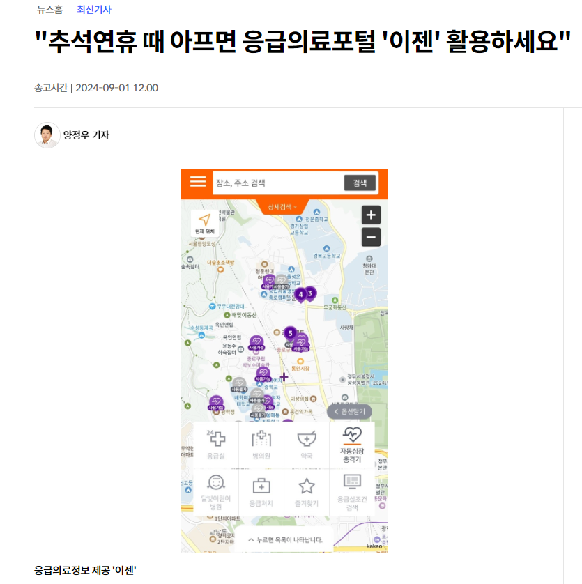 응급의료포털 "이젠(E-Gen)"은 보건복지부와 국립중앙의료원이 운영하는 응급의료 정보 제공 서비스입니다. 이 포털은 사용자 위치를 기반으로 주변의 응급실, 병의원, 약국, 그리고 자동심장충격기(AED) 위치 등의 정보를 실시간으로 제공합니다. 이를 통해 특히 명절이나 공휴일과 같이 많은 의료기관이 문을 닫는 기간에도 가까운 응급의료 서비스를 쉽게 찾을 수 있습니다.