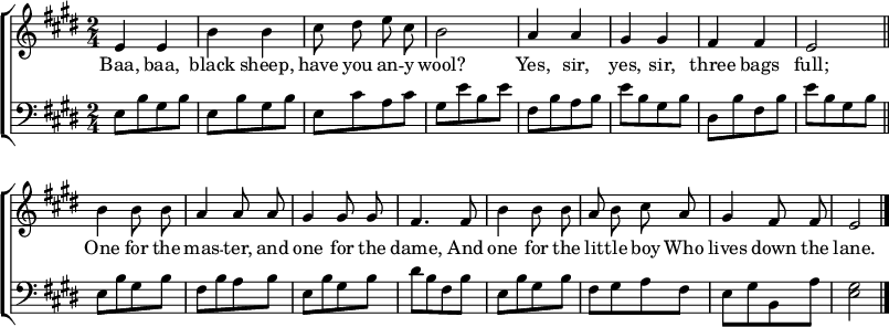 Baa, baa, black sheep, Have you any wool? Yes sir, yes sir, Three bags full. One for the master, And one for the dame, And one for the little boy Who lives down the lane.