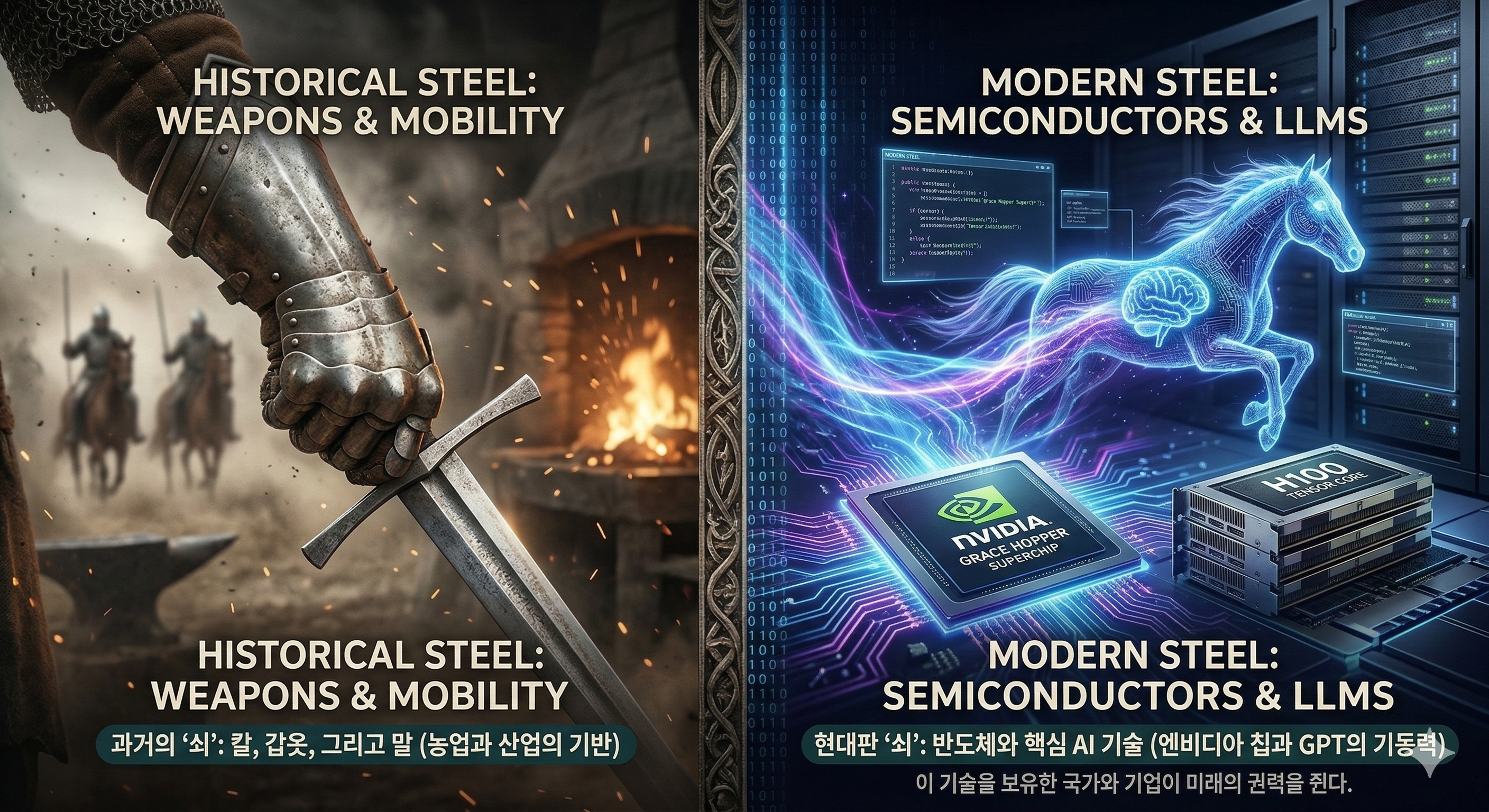현대 사회에서 이 '쇠'의 자리를 대체한 것은 '반도체'와 '거대 언어 모델(LLM)' 같은 핵심 AI 기술입니다.