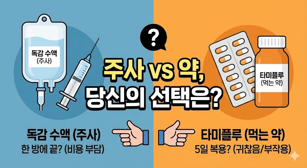 💡 요약: 가성비는 타미플루, 편리함과 빠른 회복은 페라미플루입니다. 특히 B형 독감으로 속이 안 좋은 아이들에겐 주사가 훨씬 편할 수 있습니다.